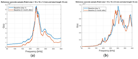 As shown in Figure 19, the small 10 cm steel rod embedded in RC was not damaged and was used as a reference point. With the 10 mm × 10 mm × 1.5 mm patch size (placed at the bottom of the concrete), the baseline admittance signature is recorded for day one and again after 3 months as shown in Figure 20a. It shows no significant changes in shape and peak placement, beside a small offset, which can be observed. This shows that some precaution must be taken, when using the whole impedance spectrum as damage quantification, such in the RSMD, because these natural variations in the electrical admittance/impedance, may give false readings. For 10 × 10 × 0.5 mm (placed at the top of the concrete) (see Figure 20b) baseline day 1 and 3-months after signature shows a more unclear picture, where there are some shift-movements and new peak areas, even though no damaged has been introduced to the concrete sample.