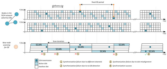 On the other hand, the nodes that want to join the network start a scanning process. In this process, the nodes go through the different pre-configured channels, for a certain period of time, until they receive an EB correctly. This synchronization process will take longer depending on different factors such as the total number of configured channels, the time each channel is scanned or the transmission period of the EB message. Figure 1 shows a representation of the main causes that can lengthen this synchronization process, such as no Enhanced Beacon being sent during scanning time or the channel being scanned not matching the channel on which the Enhanced Beacon message is being transmitted.