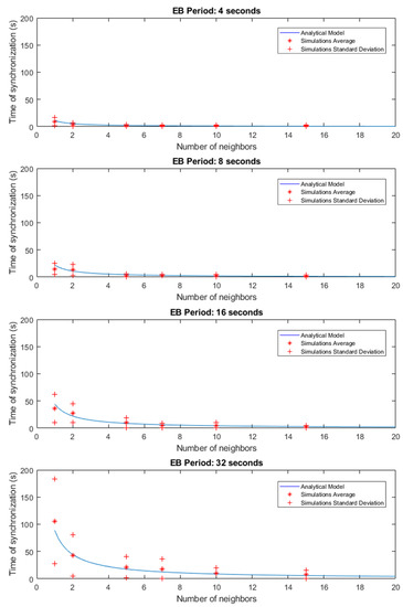 In the case of the simulations for TSCH, both the number of neighbors already synchronized and the period of beacon transmission were modified, allowing the behavior with different configurations to be observed. On the RPL side, its configuration was left as the default, leaving the Trickle Timer to modify the DIO transmission period. The simulation ends at the moment the new node receives the EB message in order to synchronize with the WSN. Table 5 shows a summary of all the variations of each parameter to be modified in the TSCH simulations. The combination of all these configuration parameter variations gives a total of 24 simulated configuration variations, and 30 iterations were performed for each of them.