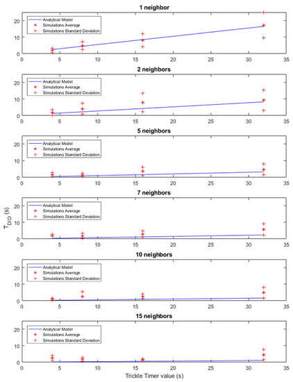 Figure 5 shows the results obtained in the simulations carried out for the RPL part. The model and the results obtained have been represented using six different graphs depending on the number of neighbours, showing the results in the same way as in the case of the TSCH synchronization time. These graphs show how the time it takes the new node to obtain the information about the RPL tree increases in a linear way as the period between DIO messages increases, showing a higher dispersion of the standard deviation at the highest values of the period. It should be noted that the periodic sending of RPL signaling messages is not the normal operation of the protocol, but in stable situations and without events that reset the value of the Trickle Timer, the period between DIO messages would reach much higher values. Moreover the behavior between the different nodes would not necessarily follow the same pattern, since the state of the Trickle Timer is individual for each node.