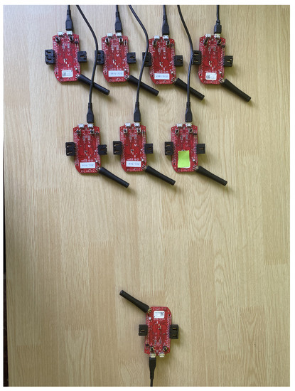 In the procedure of the real tests the same pattern as in the simulations was followed. A node was configured that will do the work of the root of the sensor network, and will start both the beacon sending process and the DIO message transmission. The rest of the nodes will be synchronized from the information generated by this coordinating root node, depending on whether it is a two or seven-node deployment. Once the first node phase is displayed, the node to be characterized is turned on, detecting through a screen log the time instants in which the node starts, the instant in which it manages to synchronize when receiving an EB message and the instant in which it obtains the information from the RPL tree from the reception of a DIO message. This process was repeated a total of 15 times for each of the variations presented in Table 6. Figure 6 shows an image of the deployment made for the real tests.