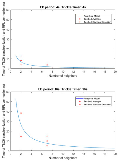 Figure 7 shows the results obtained during actual testing with RE-Mote devices. In this case, the graphs represent the sum of the total deployment and configuration time, which includes the time it takes to synchronize the new node and to obtain the configuration of the RPL tree. As mentioned above, the contribution of the TSCH part has a greater weight than that of RPL, so the shape of the curve is more similar to that of the TSCH analytical model with a Y-axis offset.
