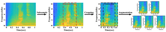 A 128-point FFT and Hamming window were applied to the STFT with an overlap ratio of 50%, and a 128 × 249-sized spectrogram was obtained. The frequency axis length is 128, and the time axis length is 249. When we perform the STFT with real number data, such as voice commands, the signal is symmetrical at 0 Hz on the frequency axis, so it is reduced in size by half, and a 64 × 249-sized spectrogram is obtained. However, as the input size increases, the computation of the CNN increases exponentially, so there is a limit to using a 64 × 249-sized spectrogram as it is. Furthermore, the data cropping process is essential because the input size must be matched to the fusion with the radar data. Thus, the obtained spectrogram was 2 × 4 subsampled to obtain a 32 × 63-sized spectrogram, and the frame of maximum power signal was cropped to the size of 32 × 28. The 32 × 28-sized spectrogram is cropped into 32 × 24 and augmented into five spectrograms. The overall signal processing of voice data is shown in Figure 2. As a result, a voice data entry with a recording length of 1 second and a sampling rate of 16 kHz was processed into five spectrograms of size 32 × 24. Figure 3 represents the nine voice command spectrograms: right, left, yes, no, stop, pull, once, twice, and unknown.