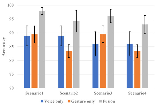 In a cluttered environment where the noise is low due to simple driving but with much residual vehicle vibration or passenger movement, the voice command will show high classification accuracy, but the gesture command will show low classification accuracy. On the other hand, in a noisy environment where the clutter is low because of no residual vibration or passenger movement, but loud noise is present from opening a window or turning up the air conditioner, a low voice command classification accuracy and high gesture command classification accuracy will be observed. However, in the proposed fusion technique, two different sensors provide complementary information. Even in a limited environment for a single sensor, sufficiently good performance is observed. Therefore, to analyze the effectiveness of the proposed system, we defined good and bad datasets and developed additional scenarios to conduct the experiments. Voice commands recorded in a simple driving environment and gesture commands without passenger interference were defined as good datasets. Voice command in a noisy environment, such as opening a window or turning on an air conditioner, and gesture command with the movement of a passenger were defined as bad datasets. There were four scenarios for the experiments. The performance of the single-sensor system and the performance of the sensor fusion system were compared and analyzed for each scenario. The performance table for each scenario is shown in Figure 10.