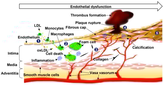 Development of atherosclerosis. (1) Dysfunction of endothelial cells (ECs) leads to migration of low-density lipoproteins (LDLs), resulting in the expression of monocyte adhesive molecules on the ECs and inflammation. (2) Monocytes transmigrate intima and differentiate to macrophages binding to oxidized LDL (oxLDL), which causes the formation of foam cells and cell death. Fatty streaks are developed and vasa vasorum begins to be built. An additional increase in foam cells and macrophage necrosis induces core of extracellular lipid and calcification of the plaque occurs. (3) Successive inflammation gives rise to the migration of smooth muscle cells with collagens from the media to the intima forming a fibrous cap. (4) Further accumulation of plaque and inflammation causes the thickness of the fibrous cap to be thin, and eventually, the plaque’s fibrous cap ruptures, forming thrombus. (5) Plaque stabilizes, resulting in a stenosed lumen area [,].