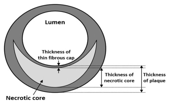 Figure 3 shows the thicknesses of the necrotic core and plaque. The relationship between the thickness of the necrotic core and plaque vulnerability was studied by Ohayon et al. []. Using 24 in-vivo IVUS studies and a large set (n = 5500) of idealized plaque morphologies under the positive remodeling condition, the dominant morphological factors affecting plaque stability were assessed. A computational simulation was employed, and the threshold stress value that triggers plaque rupture was assumed to be 300 kPa based on previous studies [,]. The results showed that, when the RI is small, lesions with a relative core thickness (100 core thickness plaque thickness measured at the location of the thin fibrous cap) of more than 50% were more prone to rupture. In other words, in the early stages of atherosclerosis, plaque vulnerability mainly relies on the thickness of the necrotic core rather than the area of the necrotic core or thickness of the fibrous cap. Similar studies have been carried out and support the results that the thickness of the necrotic core has an impact on plaque rupture [,,,]. For this clinical indicator, IVUS imaging should be able to distinguish the necrotic core from the plaque compositions, which requires accurate tissue characterization. This can be performed by detecting changes in the intensity and spectrum of the ultrasound reflected from each blood vessel layer. However, the identification of the necrotic core is currently limited in IVUS imaging due to its inaccurate border detection.