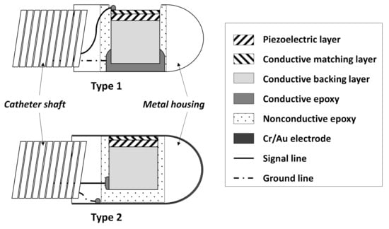 To connect the signal and ground lines to the acoustic stack, a coaxial cable was used. Based on the method for connecting the signal and ground lines, the structure is mainly divided into two parts, as shown in Figure 5. In type 1, the signal line is attached to the front face of the transducer aperture, and the ground line is connected to a conductive backing layer, a metal housing, and a shaft. Type 2 is a signal line attached to the backing layer, and the ground line is formed by the Cr/Au sputtering method covering the front face of the transducer aperture and the metal housing. Current commercial IVUS transducers employ a type 1 structure considering the mass-production process and fabrication cost, and type 2 structures are extensively exploited in the laboratories of universities [].
