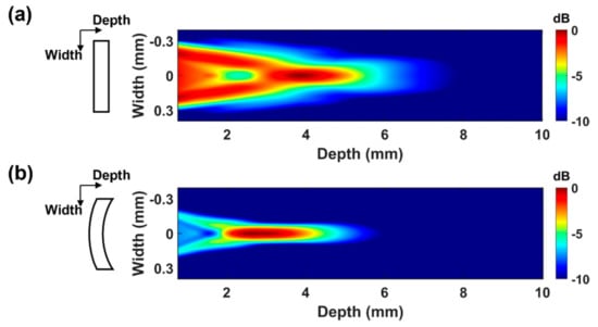 where , , , , and are the natural focal depth, aperture diameter, wavelength, sound speed in the medium, and frequency, respectively. Note that optimal ultrasound imaging can be performed in the Fraunhofer zone if an unfocused transducer is used. Figure 6 shows the one-way radiation patterns obtained by finite-element-analysis-based simulation (Onscale, Cupertino, CA, USA). A disk-shaped aperture with a 0.6-mm diameter was used, and the center frequency was set to 80 MHz. Based on Equation (9), the natural focus of the flat aperture transducer is formed at 4.8 mm deeper than where the fibrous cap is located (see Figure 6a). Therefore, beam focusing is not located at the desired position for the detection of a fibrous cap. On the other hand, the geometrically focused transducer can form a focal region within the near field (also called the Fresnel zone). As a result, the best lateral resolution can be obtained around the position of the fibrous cap. Note that spherical geometric focusing can improve the lateral resolution, even though the geometrical focal point is set to around the natural focal depth []; the focal region of the radiation pattern created by a spherically shaped transducer with a radius curvature of 4.8 mm (i.e., the natural focal depth) was around 3 mm, as shown in Figure 6b.