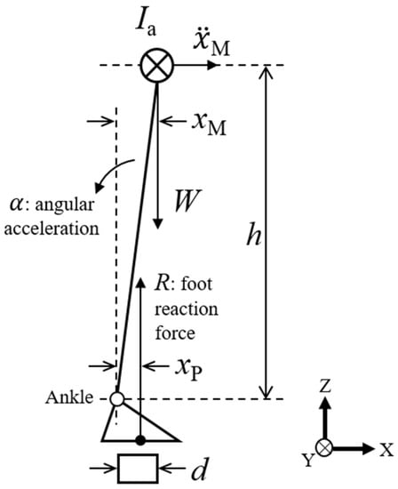 Based on the assumption that the objectives of postural control are the orientation of the CoM and the generation of less perturbation, the position and acceleration of the CoM were used as the objective variables for the postural system. Winter et al. [33] proposed the inverted pendulum model of the body in the sagittal and frontal planes. As is shown in Equation (1), the postural sway on the sagittal plane is described using the anterior–posterior positions of the CoP and CoM as xP and xM, respectively: