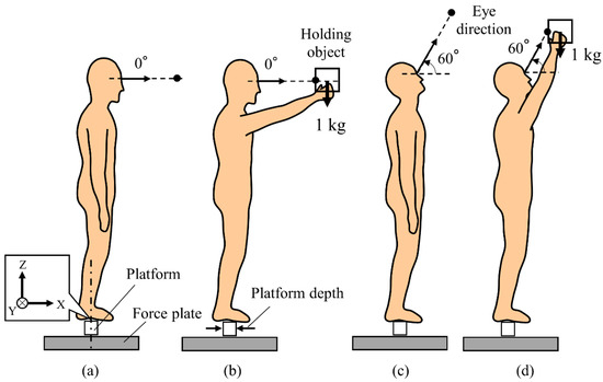 This experiment controlled the platform depth in the anterior–posterior direction and the working postures as the experimental factors. The platform depth was set at four levels: 6, 8, 10, and 15 cm. The depths were determined based on the typical dimensions of ladders, stepladders, and scaffolds, respectively [37,38,39]. The working posture was set at four levels as shown in Figure 2: standard (STD), OH, UV, and OH&UV conditions. In the STD and OH conditions, the participants fixed their vision on a point ahead of them at eye level. Additionally, the OH condition required the participants to hold a 12-cm cubic container (1-kg weight) at eye level using both hands. The UV condition required the participants to view a point located 60° above eye level. In the OH&UV condition, the participants lifted the container upward toward 60° from eye level and viewed the center of the container. Previous studies used various time durations for maintaining a posture of quiet standing, such as 7 s [29], 20 s [40], 30 s [17,41], 60 s [29], and 90 s [42]. This experiment set the duration at 60 s as an intermediate value. Moreover, the holding load was determined assuming that the worker was performing a task involving handling an object in the direction of the ceiling, although the weight used was lighter than the objects handled in previous studies, such as 2.2 kg [30] and 5.2 kg [43].