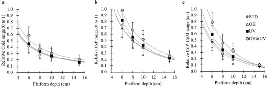 Figure 5a–c shows the relative ranges against the platform depth for the CoM, CoP, and CoP–CoM, respectively. For all three dependent variables, the relative ranges nonlinearly increased with the decreasing platform depth. The ANOVA showed that the main effects of the platform depth, working posture, and their interaction were significant for all dependent variables. Regarding the interaction between the platform depth and working posture, the effect of the working posture was significant for all platform depths, except for the 15-cm platform. Therefore, the relative ranges for the OH&UV postures became significantly wider with the decreasing platform depth than those for other depths. The relative range for the CoP was near 1.0 under the 6-cm depth × OH&UV posture condition.