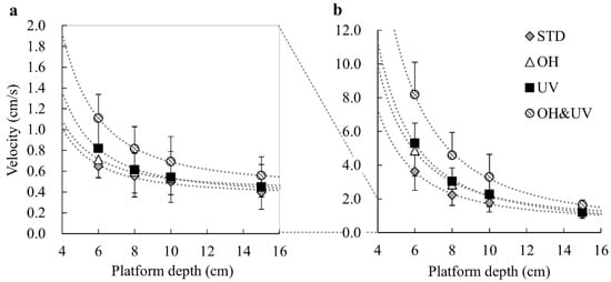 Translational velocity of the (a) center of mass and (b) center of pressure. Dotted lines show the approximate curves for the negative square of the platform depth (y = a/d2 + b). For coefficients of the fitting functions and the significance test of the regression model, see Appendix A.