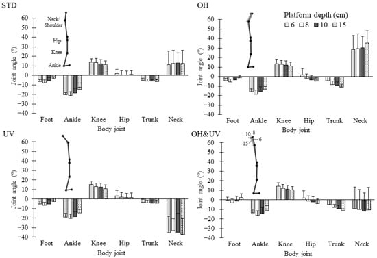 Figure 7 presents the mean joint angles for flexion and extension and the stick diagrams projected on the sagittal plane. The ANOVA for the neck angle showed the significant effect of the working posture, whereas the platform depth had no significant effect. The mean neck angle for the STD condition was 11° of flexion. The OH posture increased the angle to 30°, whereas the UV posture decreased the angle to −35°. As a result, the mean angle under the OH&UV condition was −10°. The trunk inclination angles had negative values (backward tilt) for all conditions. The OH posture significantly increased the backward tilt. In contrast, the UV posture made the angle close to zero. The hip angles were significantly affected by an interaction of the platform depth and the working posture (p < 0.001). The hip angle had negative (extension) values for the OH and OH&UV postures versus positive (flexion) values for the STD and UV postures, although the differences among the working postures were less than 10°. The ANOVA for the knee joint angle showed only a significant effect for the platform depth (p < 0.001). Significant differences were also noted among all depths, and the knee angle increased from 10.9° up to 15.1° with narrower depths. The ANOVA for the ankle joint angle showed the significant effects of the platform depth and the working posture (p < 0.001 for all tests). The ankle angle was negative (dorsiflexion) under all conditions. When comparing the platform depth levels, the 8-cm depth platform had the maximum angular displacement (19° of dorsiflexion) from the neutral position. Compared with the dorsiflexion angle of 19° for the STD posture, the OH posture decreased the angle to 16°, and the OH&UV posture decreased the angle to 13°.