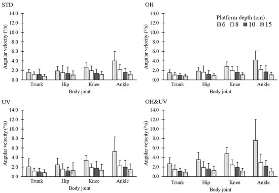 Figure 8 shows the angular velocities of the trunk inclination, hip, knee, and ankle joints. The ANOVA for the trunk and hip angular velocities showed similar significant effects for the platform depth and working posture as well as their interactions (p < 0.001 for all tests). For both the trunk and hip joints, the angular velocity significantly increased with the 6-cm platform depth and decreased with the 15-cm depth, although the increase was noted only for the OH&UV posture with the 6-cm depth. The maximum angular velocities for the trunk and hip were 2.7°/s and 3.5°/s, respectively, under the conditions of a 6-cm platform depth and the OH&UV posture. The ANOVA for the knee showed significant effects from the platform depth and working posture (p < 0.001 for all tests) as well as the interaction (p < 0.001). The multiple comparison test indicated significant differences among all levels of the platform depth. Additionally, the angular velocity increased for the OH&UV posture only with the 6-cm platform depth. The ANOVA for the ankle showed significant effects from the platform depth and working posture (both p < 0.001) as well as the interaction (p < 0.001). The effects of the OH&UV posture were significant for the 6-cm platform depth. The maximum angular velocity for the ankle was 7.6°/s under the conditions of the 6-cm platform depth and the OH&UV posture.