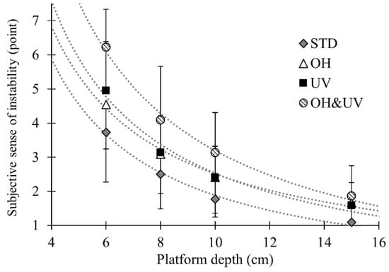 Subjective sense of instability as a function of the platform depth. Dotted lines show the approximate curves for the reciprocal of the platform depth (y = a/d + b). For coefficients of the fitting functions and the significance test of the regression model, see Appendix A.