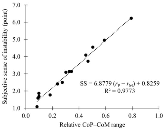 Figure 10 shows the relationship between the subjective sense of instability and the relative range of the CoP–CoM distance (rP − rM). The plotted data consist of the mean value of each condition. The correlation analysis showed a high linear correlation between the two indices (r = 0.988).