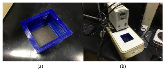 To ensure accurate temperature measurements, a calibration was performed with a 10 cm × 10 cm blackbody, which consisted of a matte, black-painted aluminum plate with a smooth texture. The plate was placed inside a sealed container, as shown in Figure 1a. The container with the blackbody was placed inside the thermal bath depicted in Figure 1b.