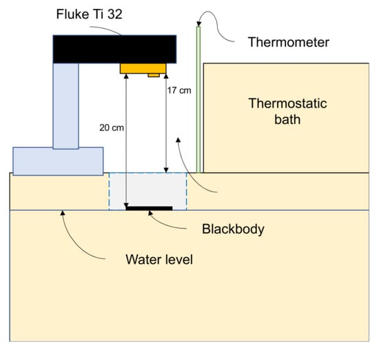 The thermal camera emissivity was set to 98%, as this value corresponds to the human skin thermal property, which could be considered as a blackbody [38]. Then, the sensor was placed 20 cm away from the blackbody surface and a standard thermometer was located inside the container. The water was heated from 22 to 44 °C in 2 °C steps, with a settling time of 2 min at each step for temperature stabilization. The temperature was measured on the center point of the plate, which is expected to have a homogeneous distribution along the surface. Figure 2 describes the diagram of the calibration system.