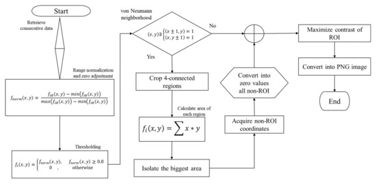where is an array with thresholded values. The values below 0.8 were set to zero, converting them as background components, meanwhile, the values higher than 0.8 were kept as their normalized original value. Equation (3) homogenizes the components of the background, removing several interferences in the background. However, some IR interference may be strong enough to remain present in the background of the thresholded array . In the binarized image fbin(x, y), these artifacts correspond standardly to isolated objects with a small area with respect to the RoI. Equation (4) describes the detection of the regions with enough temperature intensity that remains in :