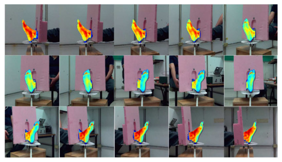 Each volunteer was seated with the right lower limb in a straight position and was instructed to remain as steady as possible. The foot rested over a support base with an angle guide and thermal insulating background, as illustrated in Figure 3. The proposed protocol was based on passive thermography, in which the foot was exposed to room temperature for 15 min to generate a thermal equilibrium and avoid drastic temperature changes and the samples were taken in a radial sequence. Sudden temperature fluctuations could cause surface distortions or loss of correlation at the feature-matching stage between two consecutive images.