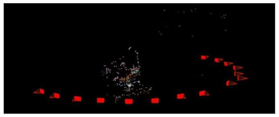 - SfM: The merged images were converted into the gray level domain by modeling a weighted addition of the R, G, and B components. Then, the sparse 3D point cloud and the camera parameters (i.e., position and orientation) were retrieved in this step. The point cloud is obtained by a cluster of homologous 2D points from the projection of the same point on different viewpoints, which are used for the estimation of the point cloud and camera poses [34].