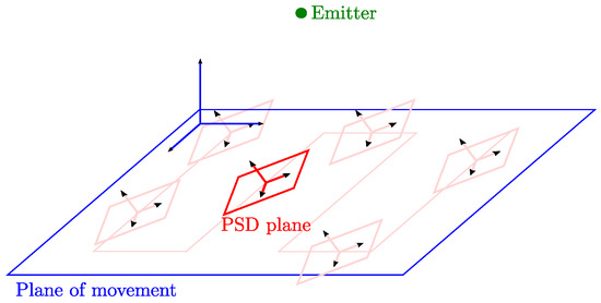- Place the mobile agents with the PSDs at different known positions in the environment along the motion plane, maintaining . Each position is defined as , where n is the receiver position number out of a total of N distinct positions.