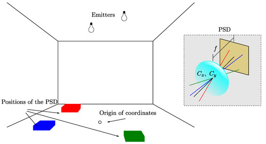 According with the introduction and considering the background of the existing research on the topic, the work presented here focuses the research on VLP systems based on PSDs. This work is based on the work shown in [47]. In that work, several proposals were made for LPS based on optical signals from PSDs as a function of the number of emitters within the field of view of the emitter. Experimental tests were performed in a real environment. Total stations (TS) were used to obtain accurate ground truth. The accuracy and precision of the each proposal were evaluated. To obtain these results, a formal geometric calibration had to be performed beforehand, as shown in [49]. This calibration requires taking different images of a very precise template, at different positions and angles. With the information retrieved from several images (usually more than 10), the parameters of the PSD + lens system, such as focal length, optical center, and radial and tangential distortion parameters, can be obtained. It is a long and laborious process. Besides, any small movement of the lens, for example, moving it from the calibration bench to its position on the mobile agent, modifies the parameters, and it is necessary to do the process again.