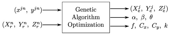 The output data of the genetic algorithm are the parameter values: position of the jth emitter in the environment , misalignment angles of the PSD system with respect to the plane of movement , the intrinsic parameters , and the lens distortion parameter .