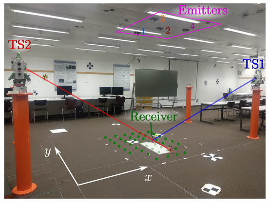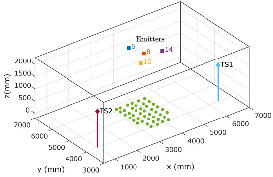Figure 5 shows the positions of the receiver (green points) and the emitters within the environment, along with the positions of the total stations used to obtain the ground truth values.