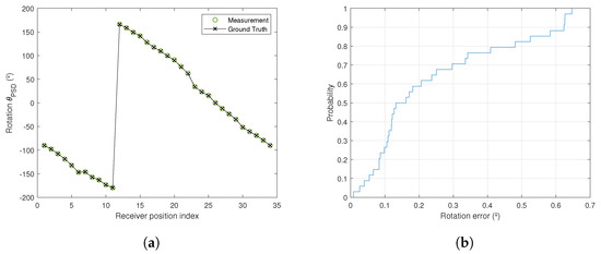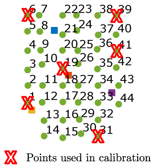 It was also mandated that the receiver always moved in the same plane. To calibrate, it is necessary to know the rotation of the receiver at each point, and when measuring in a real environment there can always be small errors when positioning the receiver. For this reason, in the calibration process we fixed the rotation, with a value of −90°, when, in fact, the angles measured by the TS vary from to (which means that we had errors of in the measurements that the calibration method must tolerate).