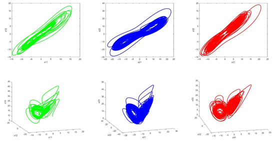 According to Figure 2, the systems are synchronized with a circular structure. In this case, the first chaotic system is described by the following expression: