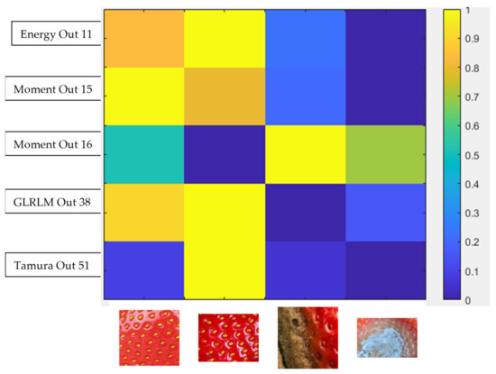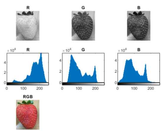 The colour and texture analysis can be performed by adapting algorithms worked out for the analysis of geological samples—those by Habrat and Młynarczuk [50], Habrat and Młynarczuk [51]. Sample images of identified strawberry fruit (with varying degrees of damage) were examined. These images were represented in RGB space. For each image, the values of sample texture parameters were determined for grey images (so images were converted from RGB to greyscale). Approximately 50 different parameters from different parameter groups were analysed. The basic statistical parameters of grey levels include volume, coefficient of variation, standard deviation, skewness, energy, and entropy. Furthermore, histogram sums and differences, 1st and 2nd order moments, and grey-level co-occurrence matrix (GLCM) transformation parameters were considered (i.e., contrast, correlation, homogeneity, the inverse of difference moment, entropy, and difference sum and variance). The features of the grey-level difference matrix (GLDM) and grey-level run-length matrix (GLRLM) transformations and popular Tamura features were also evaluated. The results were normalised to an interval of 0 (low value) and 1 (high value). Feature extraction results are within in a feature vector that can be further analysed [50,51] with respect to the texture separation ability of fruit images with different degrees of damage. The effectiveness of the mentioned parameters varies, and a preliminary evaluation allows the selection of those parameters that have the ability to differentiate. Some texture parameters differentiate ripe, rotten, and mouldy fruits—see Figure 4. Furthermore, analysis of colour channels also shows differentiation depending on the existence of mould—see Figure 5 and Figure 6. There is a marked increase in high brightness in G and B channels for a mouldy fruit.