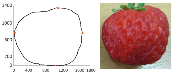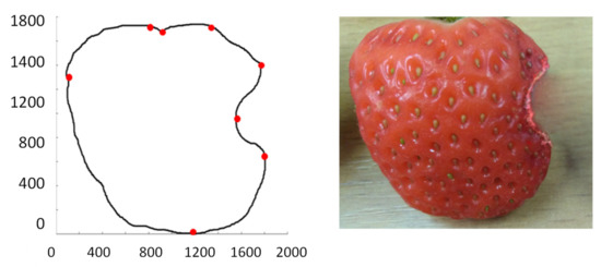 Using the structural–syntactic contour analysis described in Bielecka et al. [52], Bielecka et al. [53], and, first of all, Bielecka [54], the contour analysis of undamaged and damaged strawberries was carried out. Structural–syntactic analysis of the contour consists in dividing the examined contour into primitives. The proposed primitives are fragments of curves forming a 16-element set. Each of the primitives carries information about the angle of inclination, curvature, and increment for x and y coordinates. A characteristic feature of a single sinquad is the information on to which quadrant of the coordinate system it belongs. As a result of the analysis of healthy strawberries, the descriptions of the following outlines were obtained: 14.43.32.21 and 14.41.14.43.32.21. The pattern shapes of undamaged strawberries are in Figure 9 and Figure 10. The contour understudy in Figure 10 below has been divided into four sinquads. The red dots indicate the beginning and end of subsequent sinquads. However, the shape of the strawberries is regular and therefore the number of possible patterns is small. In the process of recognising the shape of the strawberry, the obtained contour is compared to the tested patterns. An uncharacteristic indentation in any sinquads indicates damage to the fruit. The descriptions of undamaged and damaged fruit are in Table 4.