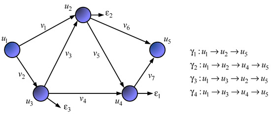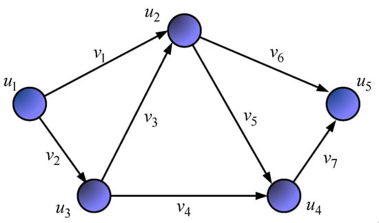 The solution described in works [17,20] and based on the description of the network structure by an oriented graph was chosen as the basis of the flow-based model of routing in the network. The set of vertices simulates network routers, and the set of graph edges describes communication links. Denote by the capacity of the link in packets per second (1/s), which is determined by the bandwidth of the th network interface on the th router. Accordingly, the numbering of links is double and is set through the number of adjacent routers.