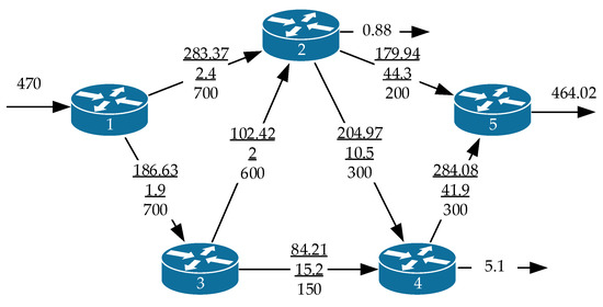 A slightly different approach to minimizing the network links utilization is proposed, for example, in [36,37]. They propose to minimize the upper bound of all network links utilization to avoid the situation where some links will be overloaded and some will be underloaded. Such solutions meet the requirements of the Traffic Engineering (TE) concept, which was designed to ensure a balanced use of network resources such as the bandwidth of communication links and buffer queues on routers in the process of solving traffic management problems (routing, link, and buffer resource allocation). In this case, as shown in [36,37], the optimality criterion may take the form: