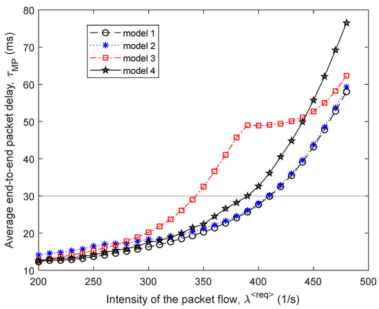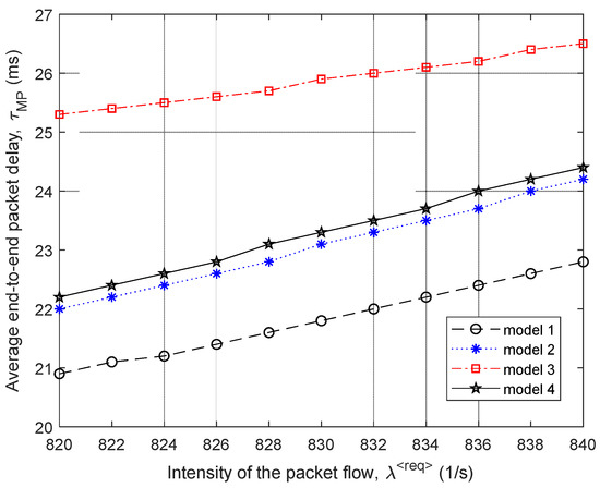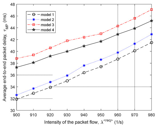 Each of the models 1–4 has its mechanism for reducing the average end-to-end packet delay in the network. The proposed model (model 1) works most efficiently; i.e., it provides optimal path calculation and load balancing through optimality criterion, which is directly related to minimizing the priority-weighted end-to-end packet delays of different flows. Model 2 focuses on the indirect improvement of packet delay by organizing such load balancing to maximize network performance. Models 3 and 4, through the used optimality criteria, minimize the utilization of communication links, which also indirectly improves the Quality of Service level, including the average end-to-end packet delay. In model 3, as the optimality criterion, the additive quadratic form of link utilization coefficients is used. However, model 4, which minimizes the upper bound of network link utilization, provides a better order of load balancing according to the average end-to-end packet delay QoS indicator than model 3.