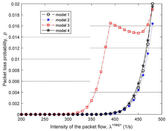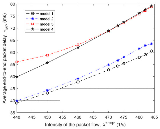 The same four routing models were studied (Figure 9). Consequently, Figure 9 and Figure 10 show the area of high load on the network when 1/s, because in this case, there were already packet losses, but they did not exceed the established tolerances; i.e., .