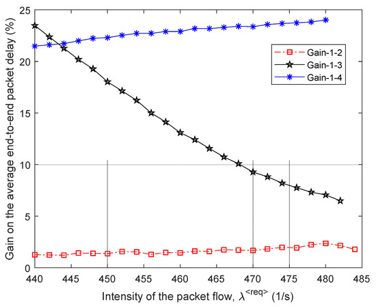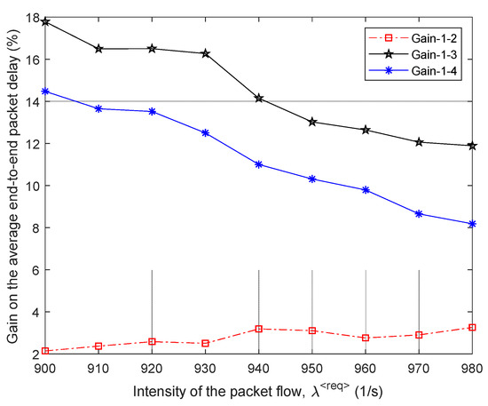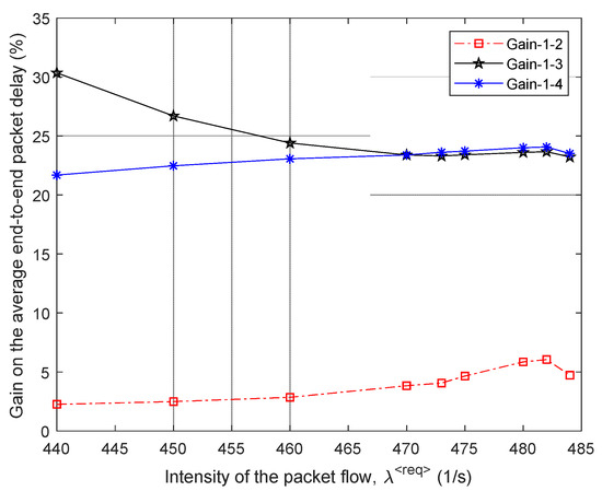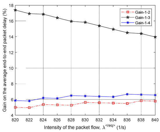 Gain on the average end-to-end packet delay from applying the proposed model (model 1) compared to other routing models depending on the intensity of the incoming packet flow (second network structure).