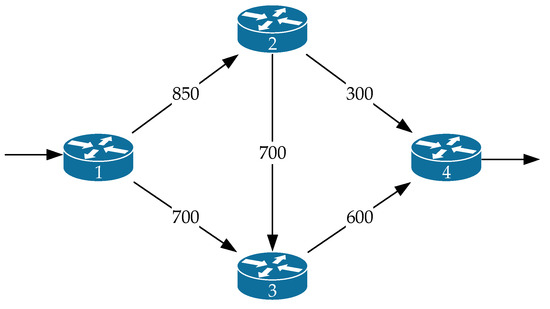 We compared the second variant of the network structure we studied to the first network structure (Figure 1). It consists of fewer routers and communication links (Figure 8), where the designation is similar to Figure 1. The source of packets was the first router, and the receiver of packets was the fourth router. The operation of each of the router interfaces was again modeled by the queuing system under the condition .