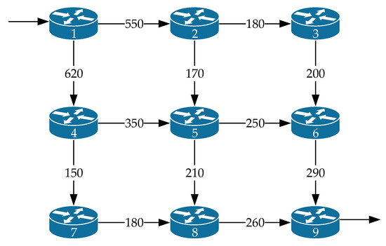 Figure 11 shows the third variant of the network structure under investigation. The network contained nine routers and twelve communication links. The notation in Figure 11 is similar to that in Figure 1. The packet flow source node was the first router, and the receiver was the ninth router. The operation of each of the router interfaces was again modeled by the queuing system , where .