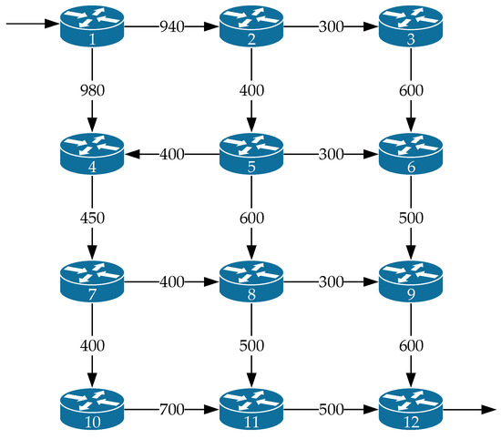 Figure 14 shows the fourth variant of the network structure under investigation. The network contained twelve routers and seventeen communication links. The notation used in Figure 14 is similar to that in Figure 1. In this example, the source of the packet flow was the first router, the receiver of the packet flow was the twelfth router, and the operation of each of the router interfaces was still modeled by the queuing system, where .