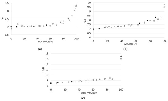 Figure 3a–c shows the theoretical spH values for the three analyzed water–solvent mixtures. Theoretical spH variation as a function of the solvent composition shows the same profile for various literature sources. However, starting at ~50 wt% methanol for water–methanol, ~65 wt% ethanol for water–ethanol, and ~90 wt% acetonitrile for water–acetonitrile, different literature sources assigned slightly different spH values.