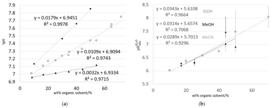 Theoretical evaluation of solvent mixtures up to ~70% solvent composition show linear progression for spH (assuming spH = ½ pKap) values of mixtures of water with methanol, ethanol, and acetonitrile (Figure 4a). For this range, linear trends are also seen for . values as a function of increasing solvent content. Graphs of solvent-specific spH values, primarily derived by theoretical means, assume the pH of ‘pure water’, wpH = 7 (at 25.0 °C). However, pH of water is generally not 7, but lower due to dissolved CO2 [46,52,53]. Comparing the trends in spH and with wt% solvent (Figure 4a,b) are then distorted as spH does not drop much below 7, unlike seen for for < 40–60 wt% organic solvent. It is worth re-emphasizing that values are on the same scale, while each spH value for a given solvent–water mixture is its own scale, i.e., the spH scale of 40 wt% ethanol is not the same scale as for 50 wt% ethanol.