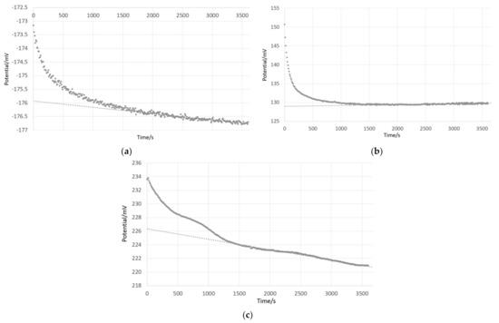 In this example, the ΔE signal increased towards a more steady drift rate, observed in the final 30 min of data acquisition, corresponding to 180 points taken at 10 s intervals. ΔE was evaluated by averaging, referred to as ‘averaging’, over these final 180 points, giving 96.71 mV, with a standard deviation ( of 2.07 mV. Linear extrapolation (y =m*t + b) to t = 0 was also employed to evaluate ΔE, referred to as ‘extrapolation’, giving: 86.27 mV, the standard deviation of the intercept, , being 0.20 mV. However, this standard deviation does not reflect the change seen between t = 1800 s and t = 3600 s. For more representativeness, the final 30 min of data were divided into two 15 min increments, and the respective intercepts were determined as: 83.63 mV and 93.44 mV, as illustrated in Figure 1. The uncertainty of ΔE evaluated by extrapolation, , equals 5.66 mV, considering the variability between the two extrapolated values and assuming a rectangular distribution.