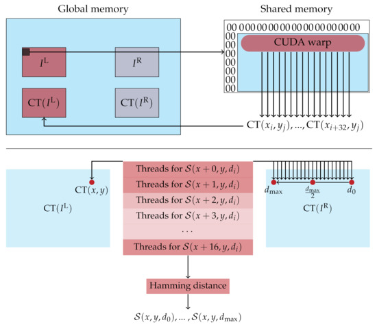 Top: To calculate the census transform by a CUDA warp for a specific image region, the image data of this region is first copied from the global memory to the shared memory, the latter having higher access speeds. In the second step, each thread of the CUDA warp calculates the census transfrom (CT) for one pixel inside this region. Bottom: The threads of a CUDA warp calculate the Hamming distance for 16 disparities simultaneously.