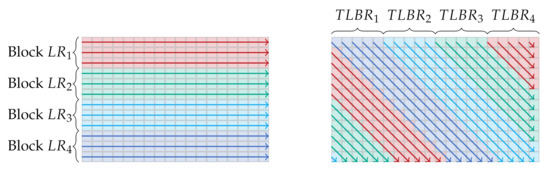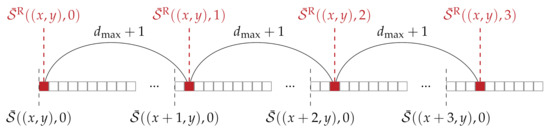 The key aspect in the consistency check is the calculation of the approximated disparity map , corresponding to the matching image. This is approximated from the calculated aggregated cost volume of the reference image . In this, each entry of is calculated according to Equation (5). The difficulty that arises in this process is the access of non-adjacent areas in , as illustrated in Figure 4. Between all entries of the aggregated cost volume that are to be used for the calculation of , always lie entries, which are of no interest.