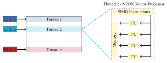 Although conventional Single-Instruction-Single-Data (SISD) processing on the CPU requires one instruction for each data transfer between the memory and the registers of the CPU, as well as for each processing of the data stored inside these registers, the additional use of vector-processors allows the performance of one instruction on a set of data simultaneously, the so-called SIMD processing. Each vector-processor is divided into multiple vector-lanes, which in turn hold one datum each. The memory unit as well as the arithmetic and logical unit of the vector-processor allow simultaneous transfer of multiple data into and from the lanes of the vector-registers, as well as to simultaneously combine the lanes of two registers and store the results into the lanes of a third register. The vector-processors of the ARMv8 architecture contain 32 vector-registers with a size of 128 bits each [45]. The number of vector-lanes inside each register differs, depending on the data type which is to be stored inside the register. Thus, each register can have 16 lanes when data with a size of 8 bits each is to be stored, or only two lanes, if each lane holds a datum with the size of 64 bits. In particular, image processing is well suited for the SIMD parallelization on vector-processors, since all pixels in an image are processed in the same manner, only with different data.
