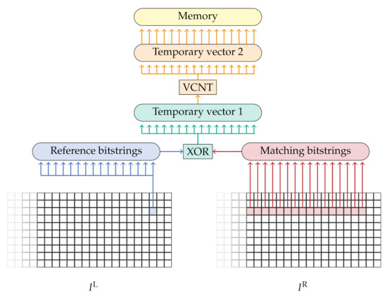 To calculate the Hamming distance between two census descriptors, namely the one from the pixel of the reference image and the corresponding pixel in the matching image, we apply the XOR operator and count how many bits are set to 1 in the final output. To count the number of bits which are set, the NEON instruction set offers a population count (VCNT) which can be applied to each vector-lane. As illustrated in Figure 7, the resulting matching cost, i.e., the Hamming distance of the CT, is stored to a three-dimensional cost volume. By using the SIMD instructions and the 32 vector-register, a maximum of 64 matching costs can be calculated simultaneously in each thread. Thus, each thread processes 16 disparities and four lines simultaneously in one iteration.