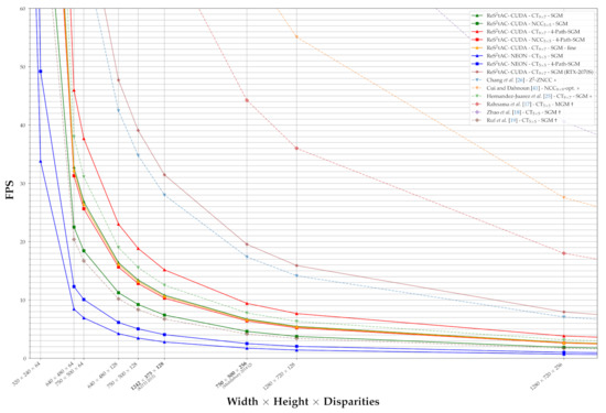 The development cycles for implementing and optimizing image processing algorithms for massively parallel processing on GPUs, on the other hand, are much shorter and thus less expensive. In addition, GPUs provide a much higher processing power, ideal for algorithms with high computational effort, such as stereo image processing. Early works [21,22] have used the rendering pipeline of OpenGL to deploy the SGM stereo algorithm on graphics hardware and reached frame rates of up to 8 FPS and 4 FPS on VGA image resolution, respectively. With the introduction of the CUDA-API in 2007, the development costs for general-purpose computation on a GPU (GPGPU) have dropped even more. And so, a lot of implementations of the SGM algorithm for real-time stereo processing on hardware without embedded constraints are optimized and deployed on graphics hardware [23,24,25]. Hernandez-Juarez et al. [25] show that with increasing computational power, the use of GPGPU on modern, high-performing graphics hardware, such as the NVIDIA Titan X, allows the reaching of frame rates of up to 237 FPS on VGA image resolution with the conventional use of eight optimization paths inside the SGM optimization. Even higher frame rates of up to 475 FPS and 886 FPS are possible, if the number of optimization paths are reduced to four or two, respectively.