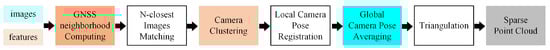 Figure 1 shows the pipeline of our method. Given the collection of images and their features from large-scale scenes with unmanned aerial vehicle (UAV), our method can effectively generate sparse point cloud using GNSS neighborhood, camera clustering, and global camera pose averaging. The images and their features are considered as inputs. The GNSS neighborhood is calculated for image matching. Camera clustering and local camera pose registration are used for global camera pose averaging. Executing triangulation and optional bundle adjustment can obtain sparse point clouds. Specifically, our method consists of the following three steps: GNSS neighborhood computing, camera clustering, and camera pose averaging.